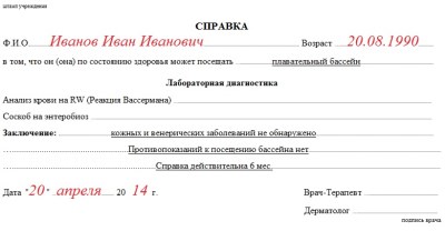 | Заполнение справки в бассейн |